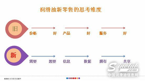 其实,传统润滑油电商模式与传统渠道零售是一致的,需要考虑三件核心事情:品质、价格、服务。但新电商,或者更准确的说新零售,则需要思考怎么能够满足用户从需要到想要、从信息到数据,从尽力让用户购买而拥有,变成用户共享的新路径。“把握则胜,不希望把它变成危言耸听的警示,而是当作改变自己的机遇,从现在开始!” |
